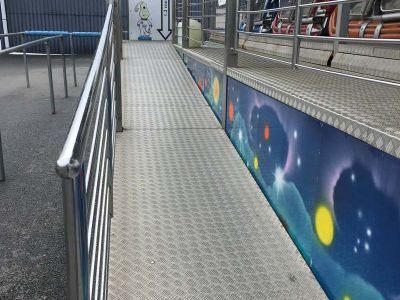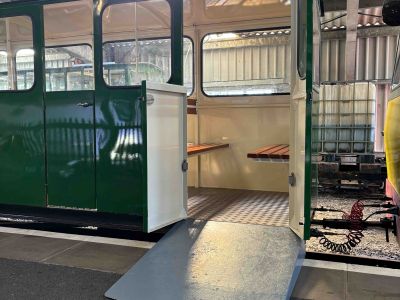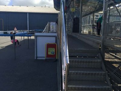 Ramp (1100mm wide) with one step to get on and the same to get off. This step can be removed to provide easier access for wheelchair users. Please let us know if you need the lights to be stopped from flashing, or music turned down.