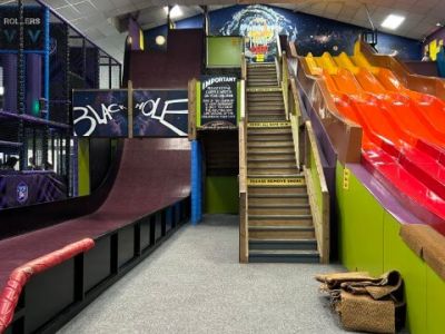 Jumping Jupiters and Gravity Rider are both accessed through manual double doors (1900mm) then down a moderate tarmac slope.